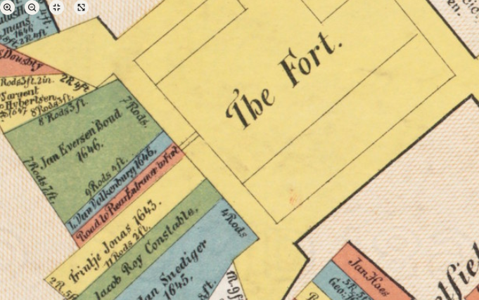 A map of 1640's New Amsterdam made in the 1800's using old land grants from the Dutch West India Company. Zooming in, you can see "L Van Valkenburg" has a plot of land in blue next to the fort.